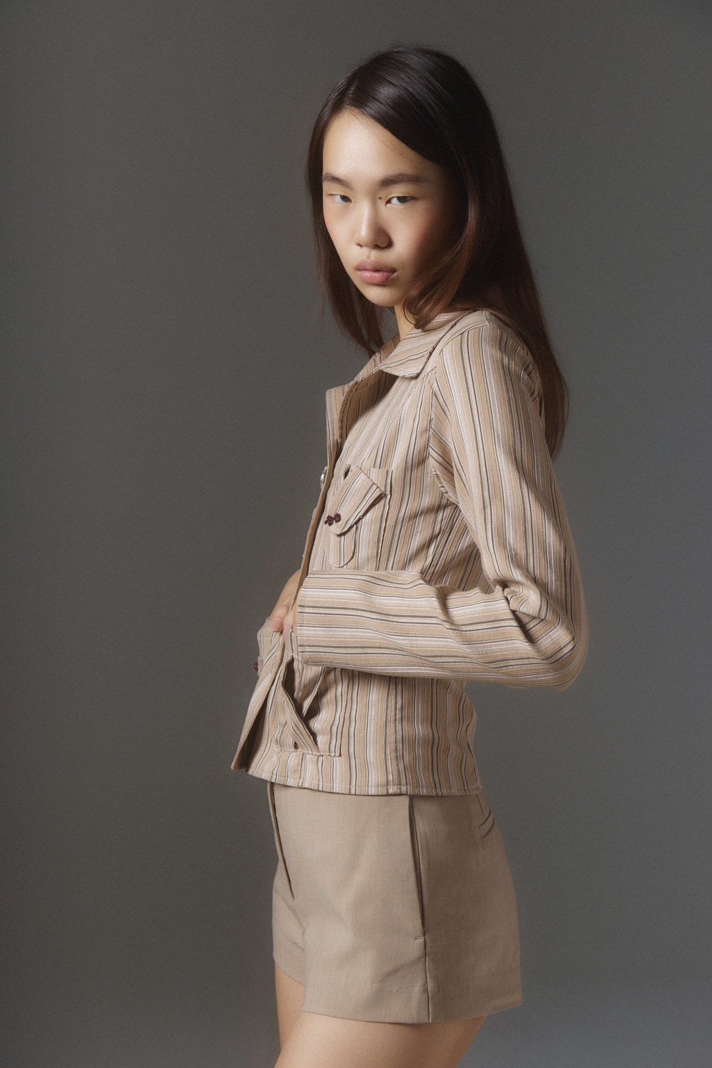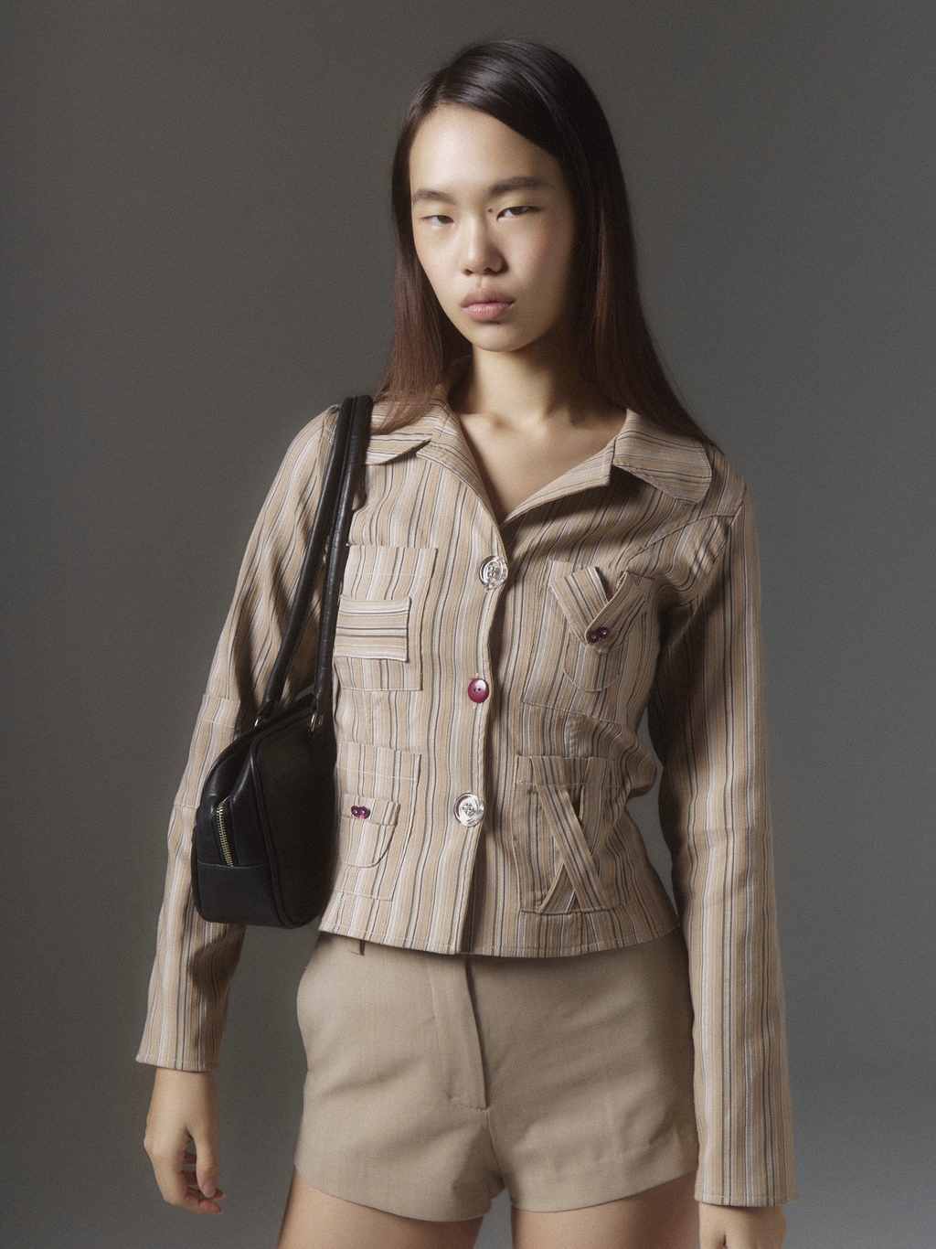 Chaqueta conformada por recortes. Lleva bolsillos superpuestos y tres tipos de botones. Trama rayadada con sutil brillito.